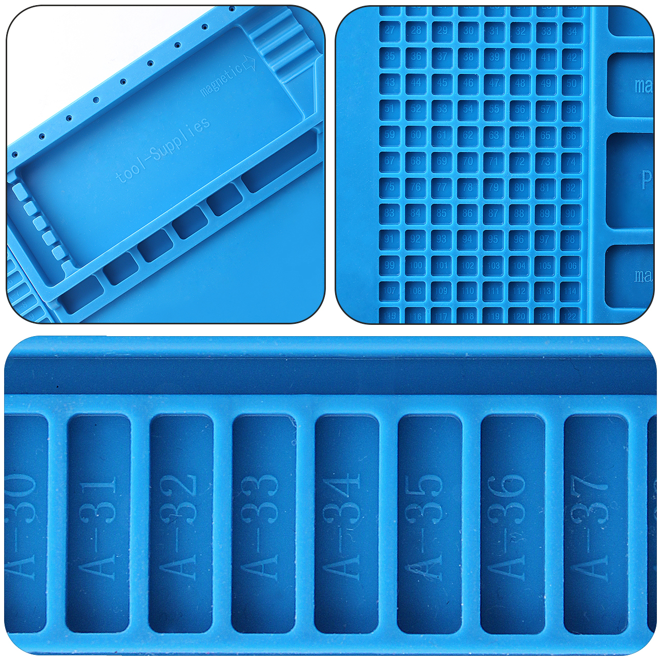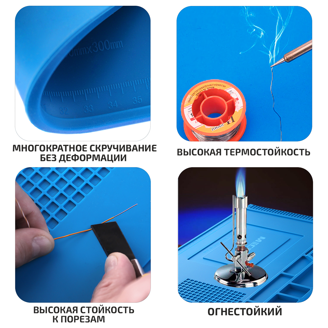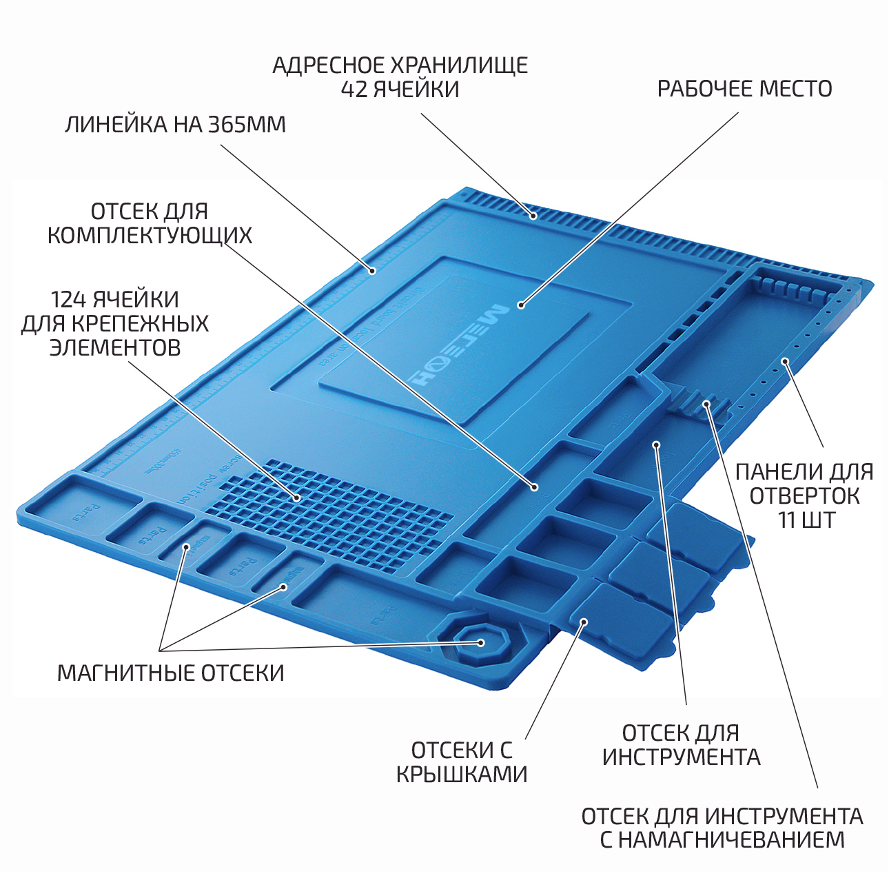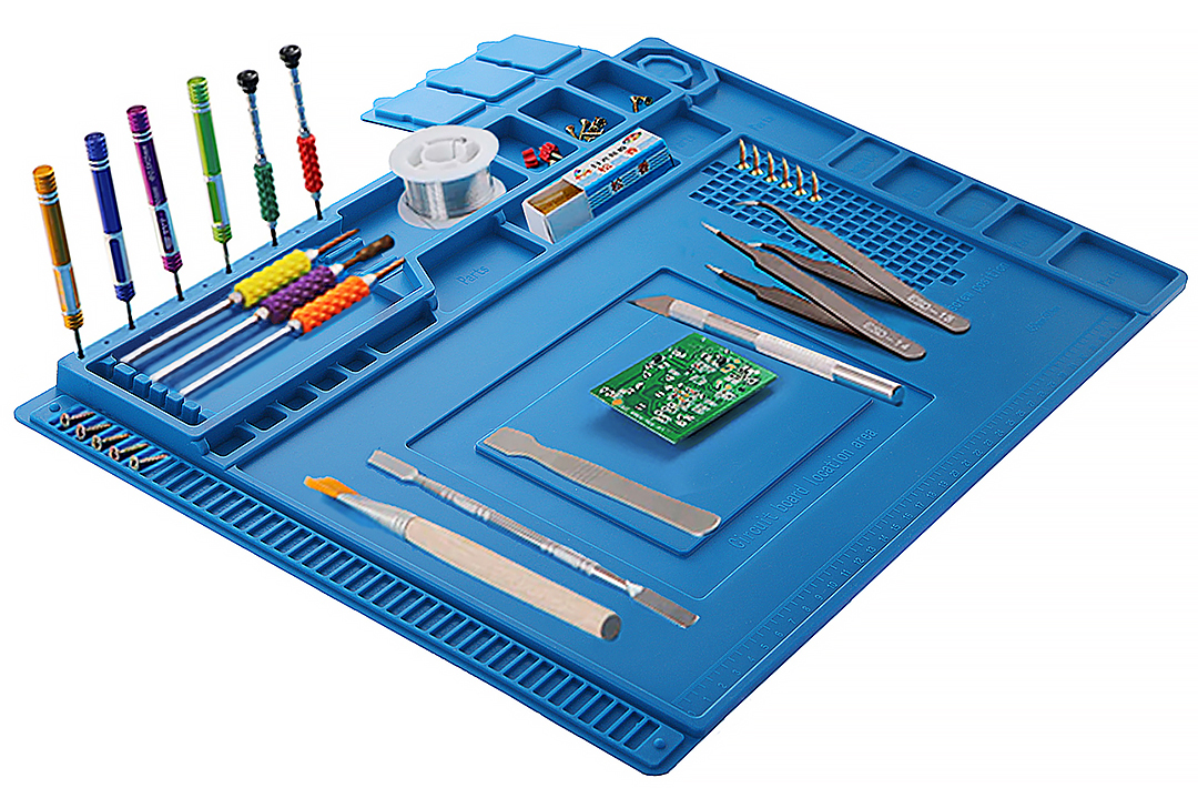 Монтажный коврик предназначен для предотвращения повреждения электро и радиоизделий статитеческим электричеством. Дополнительно в поверхность были установлены 4 магнита для надёжной фиксации металлосодержащий элементов и комплектующих. Имеются 3 лотка с крышками.