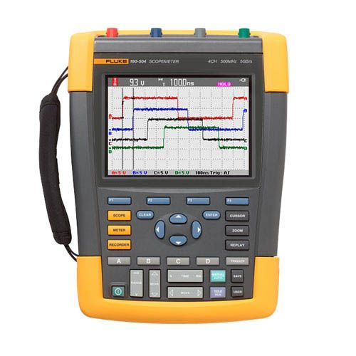 Осциллограф Fluke 190-504/S — портативный 4-канальный контрольно-измерительный прибор с опцией мультиметра и безбумажным регистратором. Применяется как при ремонте микроэлектроники, так и для диагностики сложного электрооборудования.
