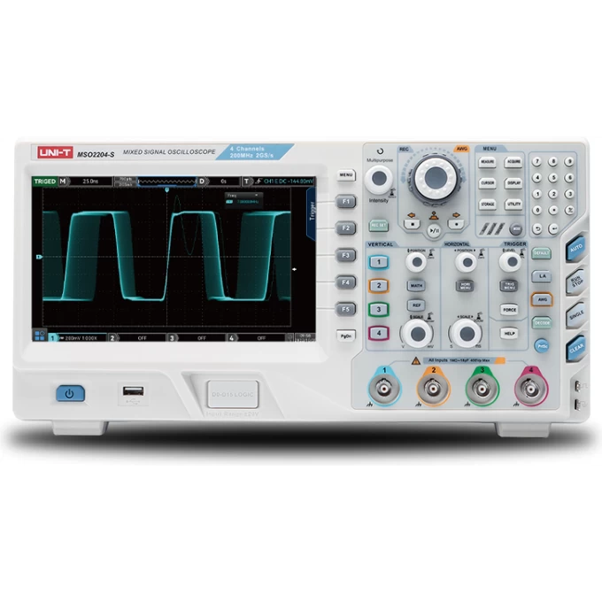 UNI-T UPO2204 - это современный запоминающий осциллограф бюджетного ценового класса с цифровым люминофором, с 4-мя аналоговыми входными каналами и полосой пропускания до 200 МГц.