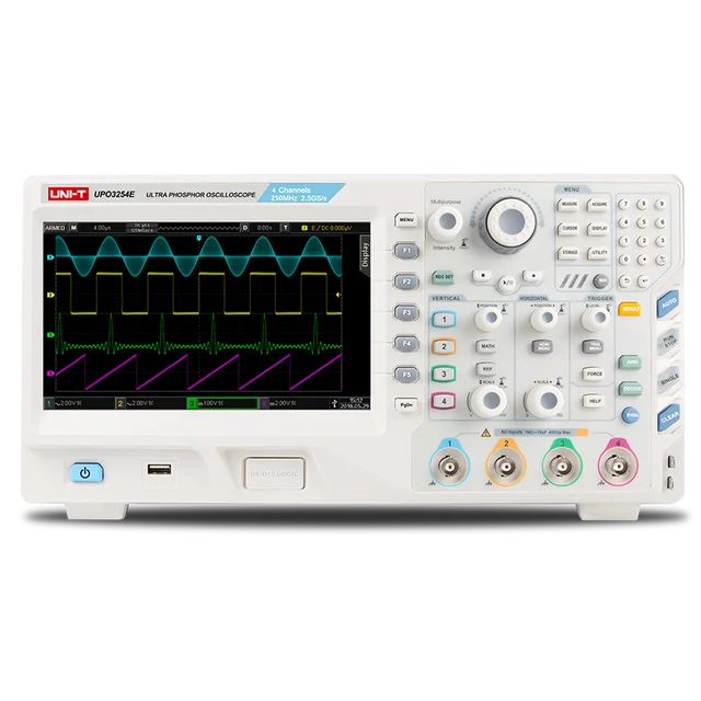 UNI-T UPO3354E - это современный запоминающий цифровой осциллограф с цифровым люминофором, с 4-мя аналоговыми входными аналоговыми каналами и полосой пропускания до 350 МГц, который по своим характеристикам водит в список топовых моделей приборов бюджетного ценового класса.