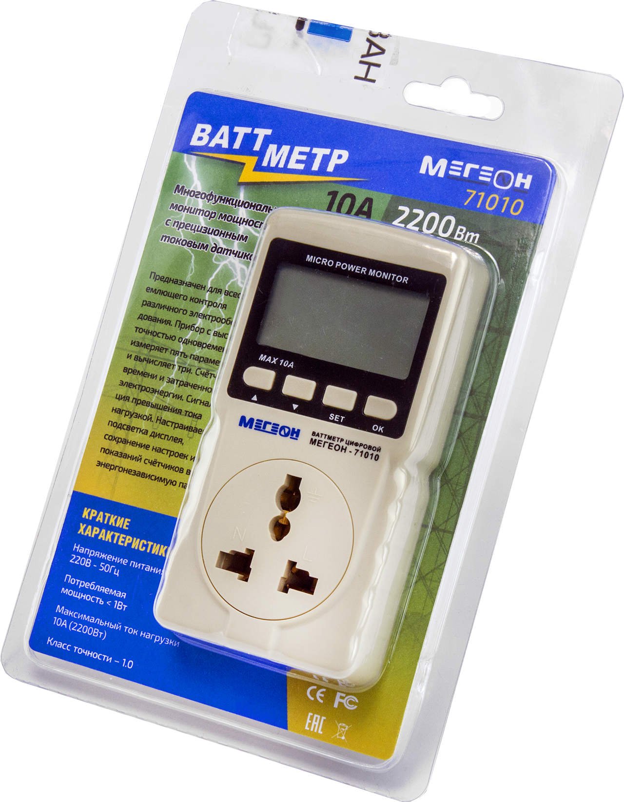Ваттметр МЕГЕ10 имеет яркий ЖК-дисплей с подсветкой, что гарантирует комфортное считывание показателей даже в условиях слабого освещения. Рабочее напряжение составляет 220 вольт, а максимальный измеряемый ток – 1 ампер, что делает его подходящим для определения мощности вплоть до 220 ватт.