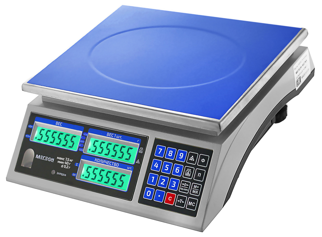 Магазинные весы с электронно-цифровым управлением. Диапазон от 0,2 до 7500 грамм. Функции весового контроля: подсчёт количества объектов на грузовой платформе, их суммирование и количественный учёт. 3 ЖК дисплея. Автономная работа.